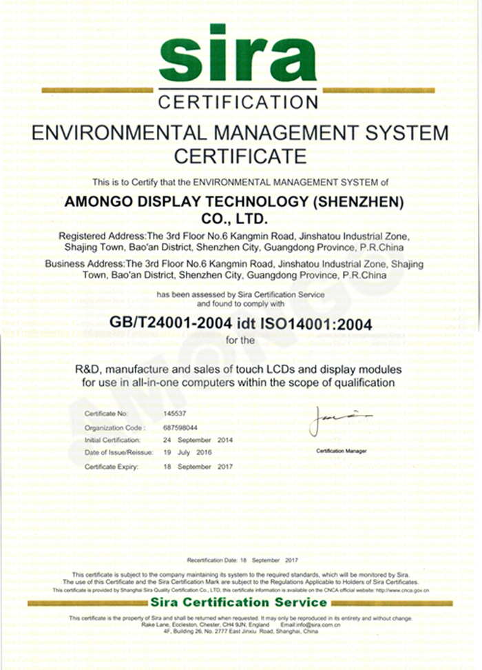 Your Position:Home>News>Company News>Amongo Passed the annual check of ISO14001 international environmental management system certification 2016.