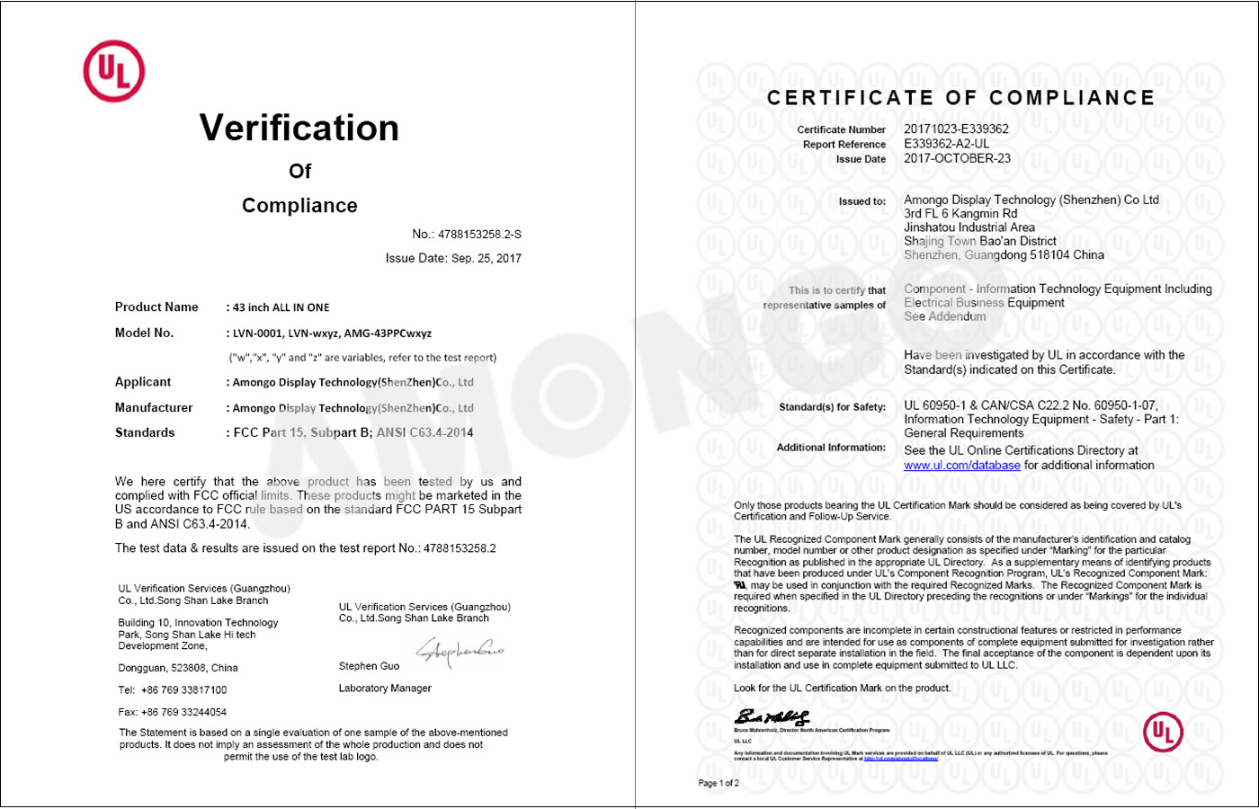 Your Position:Home>News>Company News>Amongo 43inch all in one Successfully passed UL, FCC certification