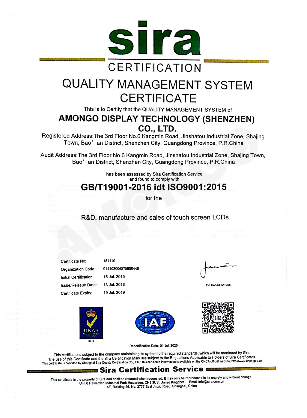 Amongo Passed the annual check of ISOT19001-2016 international quality management system certification 2018.